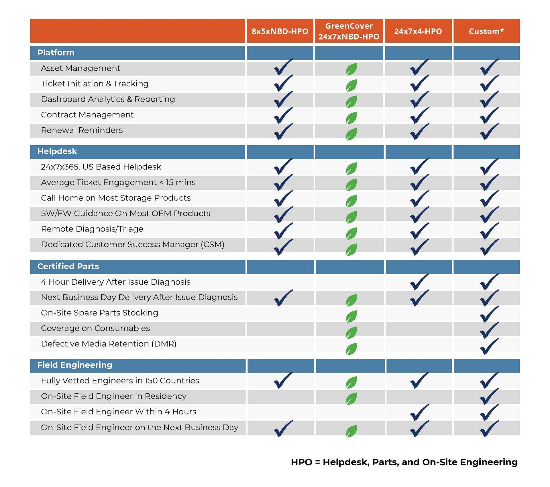 A variety of service levels (24X7X4, 9X5XNBD, etc.) for on-site or remote parts replacement